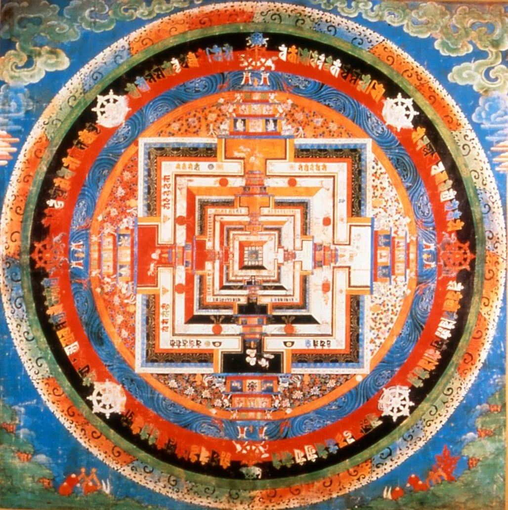 After passing through these three rings, we reach the multi-hued walls of the temple itself. Each wall has an arch or pagoda in the center, representing the doorway that leads to the heart of the mandala, where a deity is seated on a jeweled throne supported by a lotus. Different mandalas portray different deities, each of which can be thought of as an aspect of consciousness that can be transformed into enlightened awareness.